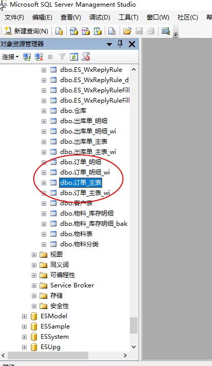 我们在模板上创建的数据表实际上存储在应用数据库中。例如,我们在ESApp1应用中创建了一个订单模板,在其上创建了两个数据表,“订单_主表”和“订单_明细”,打开SQL Server 企业管理器,我们会看到,在ESApp1数据库中增加了两个表,如下图所示。我们填报的订单信息都会存储在这两个表中。