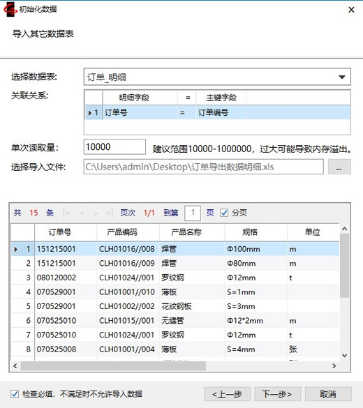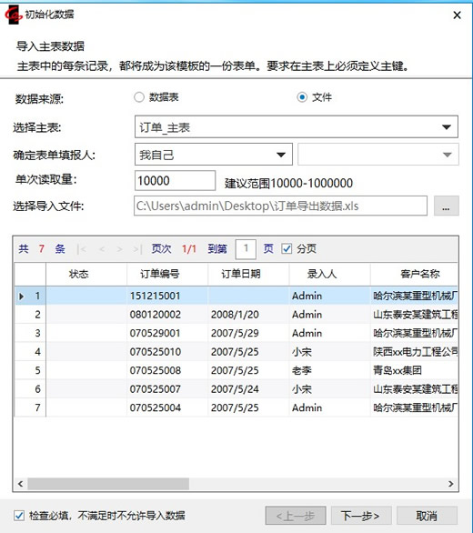 - 弹出“初始化数据”窗口,选择主表:订单_主表,确定表单填报人,然后选择导入文件,在“导入数据预览”中可以看到要导入的主表数据。点击【下一步】。