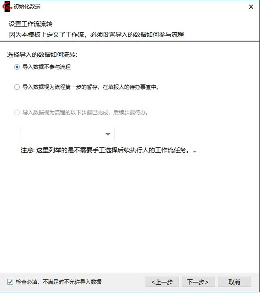 5.如果该模板下设置了工作流,那么会弹出如下对话框(否则会跳过这一步),选择导入的数据如何流转,点击【下一步】。