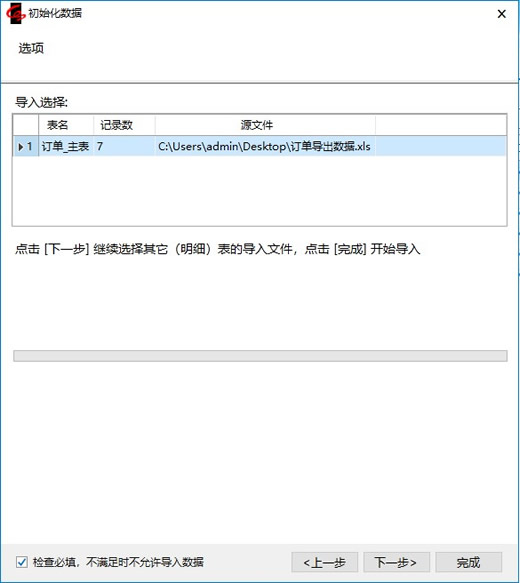 6.如果该模板仅有主表,那么直接点【完成】即开始导入,前面我们分析过了,订单模板下即有主表,也有明细表,所以我们按照提示,点击【下一步】继续选择明细表的导入文件。