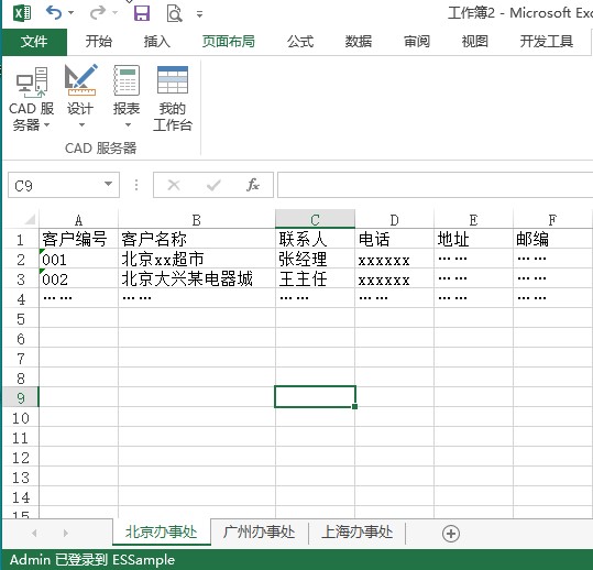 通常的Excel文件,用户对数据的操作与数据的存储是一体的。文件本身就是用来保存数据的,下图就是一个典型的例子:用一个文件来保存公司所有的客户信息,为了方便检索,把不同办事处的客户分别存放在不同的工作表中。
