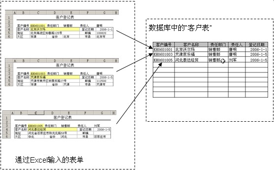 比如我们前面定义的《客户登记表》模版,它实际上提供了一个录入客户信息的操作界面,我们输入三个客户的信息,并非意味着我们保存了三个文件,不是这样的,我们没有保存任何Excel文件,只是“通过”Excel的录入界面,把这三个客户的信息保存到数据库中一个名为“客户登记表”的表中去,成为其中的三条记录。请看下图的示意: