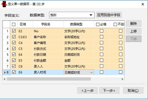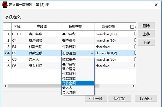 4.依次单击每行的字段名,在出现的下拉列表中选择该字段要对应到“收款单”表中的哪个已有字段,选择后数据类型自动显示,且不能修改。