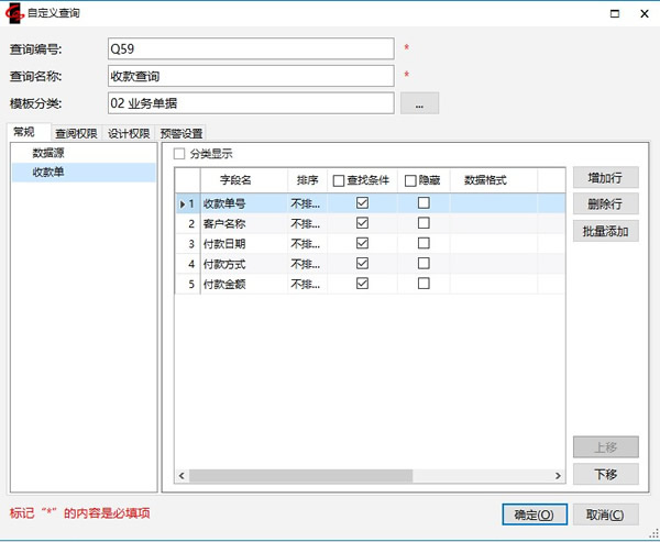 下面我们建立一个查询,查询全部收款单信息,查询定义如下图所示。设置Administrator、财务部经理对此查询有查阅权限。