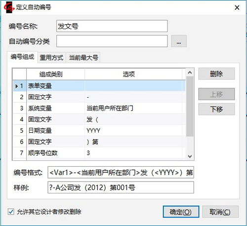 开头是一个表单变量,表示这将是模板上的一个字段,填报时,根据这个字段的值决定这段的内容。当我们把此自动编号关联到具体的发文登记表模板上的时候,将指定这个表单变量具体对应模板上的“密级”字段;