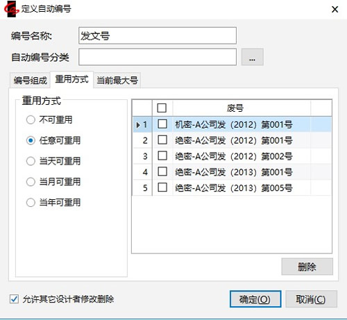 我们可以选择通过自动编号的重用方式,使得废号可以被再利用。如下图所示。