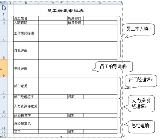 看下面这个例子。我们新建如下模板《员工转正审批表》。实际需要的流程是这样的:员工填写转正申请单,由自己的导师填写意见,然后交给部门经理和人事经理,分别审批,部门经理和人事经理都审批同意后,最后由总经理来审批。