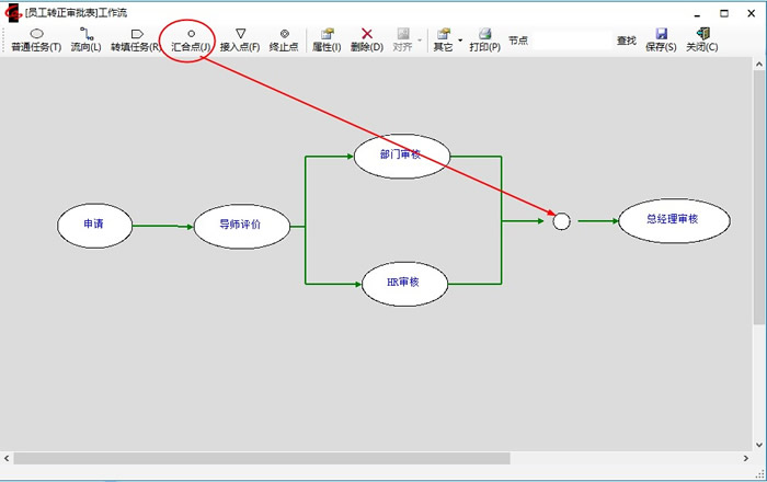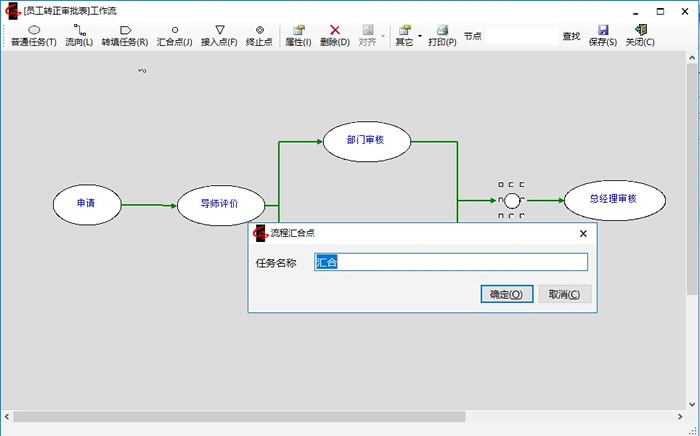 汇合点的画法与“普通任务”一样,点击工作流窗口工具栏里的“汇合点”按钮,在画图区域单击,弹出“流程汇合点”对话框,输入任务名称,点击【确定】。