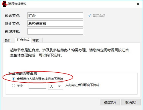例如,在上面的流程画板上,选中从“汇合点”到“总经理审批”这两个任务间的流向,点击工具栏按钮【属性】,弹出“流程连线定义”窗口,在窗口的下半部分,多出来一个“汇合完成”选项卡,切换此选项卡上,可以设置汇合后向下流转的条件。