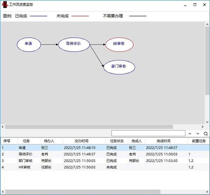 在这个流程上,“导师评价”任务之后,流程发生了分支,同时有两个后续任务“部门审核”和“HR审核”,这两个任务是并列的,它们之间没有先后顺序,在“部门审核”和“HR审核”之后,有一个“汇合点”,就是图中的小圆圈,汇合点一般都有多条流入的流向,它起一个“等待”的作用,要等待前面的多个任务都完成了之后,再继续向下走,汇合点之后,是“总经理审核”。