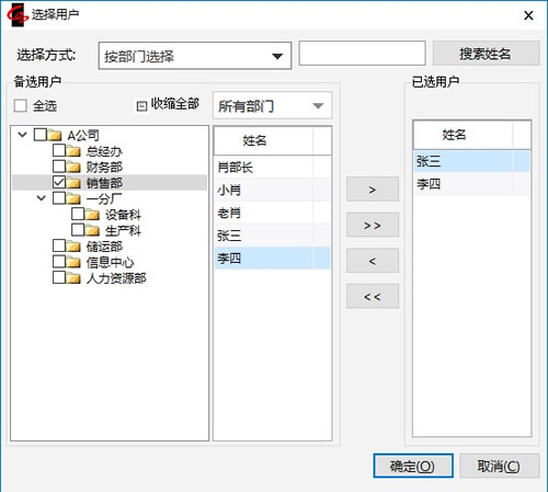 3.弹出“选择用户”对话框,选中销售部张三和李四,如下图所示,按【确定】。