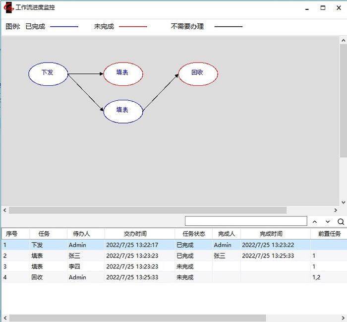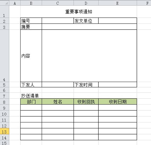 此通知单模板的工作流有三步,第一步是下发,下发人填通知单,并且选择抄送人(下面的抄送清单表格中的部门和姓名两列);下发保存后,对抄送清单中列出姓名的每个人发送待办事宜,每个人在写着自己姓名的那一行中签收。当所有该签收的人都签收了之后,最初下发的人会接到一个待办事宜,通知她(她)所有人都已经签收了。