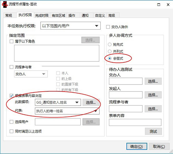 - 在任务的“执行权限”标签上,设置执行权限为“根据表单内容决定”,右侧的“多人协调方式”选择“会签式”。