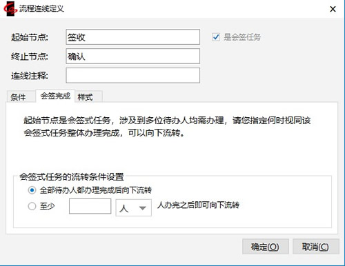 在会签式任务及其后续任务之间的流向定义窗口上,会多出来一个“会签完成”选项卡,用于设置会签完成向下流转的条件。如图,我们可以根据实际情况,规定只有所有会签的待办人都办理完成,此步才算完成,还是超过规定人数办理完成就可视同会签完成。