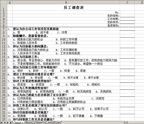 举这样一个例子。人力资源部经理下发一份员工调查表,发给所有的销售员,每人一份。各销售员填好调查表,提交到人力资源经理处,人力资源经理检查每份调查表,区分有效问卷和无效问卷。为统计员工满意度准备好条件。