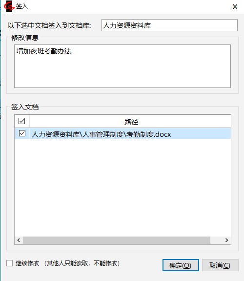 如果这次签入操作只是为了先提交到文档库,使得他人可能访问到最新的版本,但是修改过程还没有完,还要再继续修改,则可以勾选窗口下方的“继续修改”复选框,从而在签入后立即再次签出。