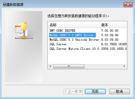 4)选择MySQL ODBC 5.3 XX Drive作为驱动程序,点击【完成】按钮。