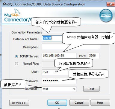 a.弹出下图窗口,按如下所示输入对应配置参数后点击【Test】按钮。