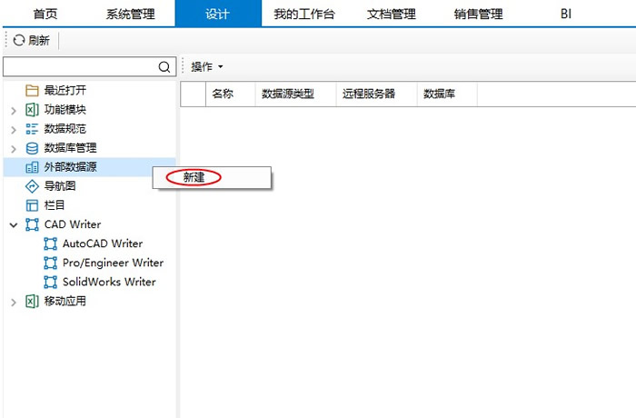 - 用Admini账户登录到应用系统,在“设计”栏目的左侧选中“外部数据源”,选择右键菜单【新建】,弹出“注册外部数据源”窗口。