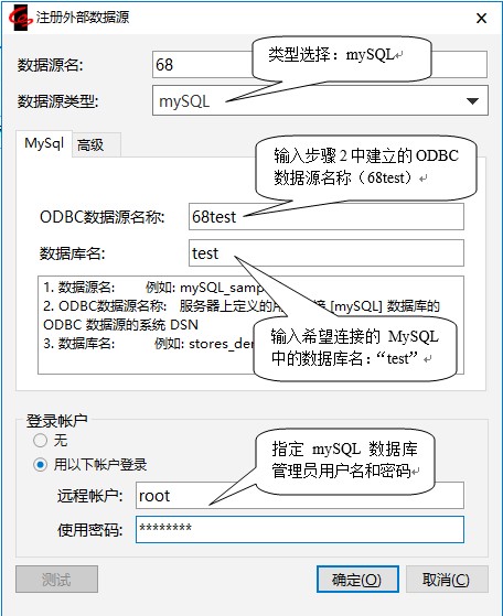 7)在弹出窗口中,输入外部数据源配置参数如下图,点击【确定】。