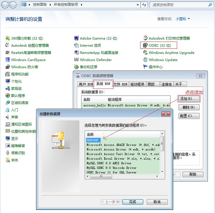 3、按照提示完成驱动安装之后,在“控制面板”->“ODBC”中,选择"系统DSN"属性页 ,点击右侧的"添加"按钮,弹出“创建新数据源”弹窗: