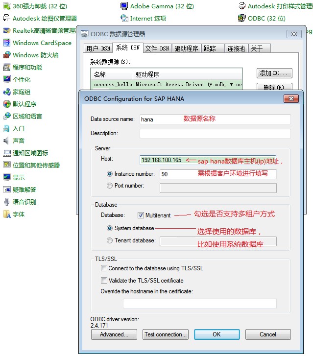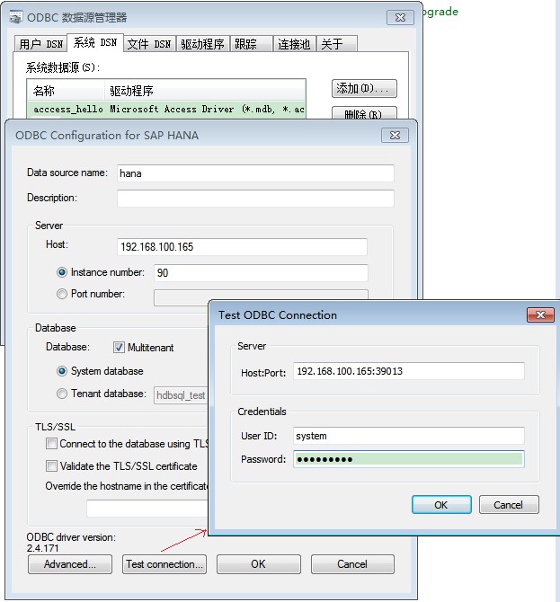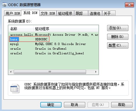 6、完成配置后,点击OK按钮,就会在"系统DSN"中看到新添加的"hana"数据源了。