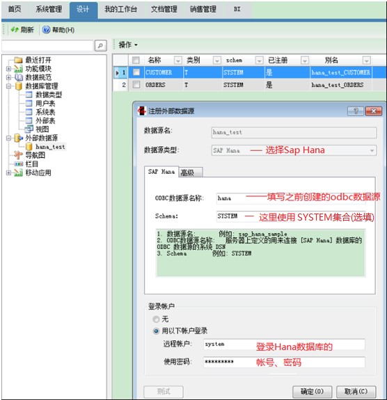 用户可以对"SYSTEM"集合中的数据表、视图进行注册并分配相关权限后,就可以像使用本地表一样操作这些SAP Hana表数据了。
