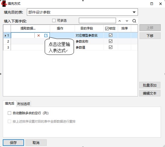 6.点击【确定】,回到“表间公式—提取数据”窗口,点击【填充方式】,弹出“填充方式”窗口,选择填充目的表为“部件信息”模板上的明细表“部件设计参数”。