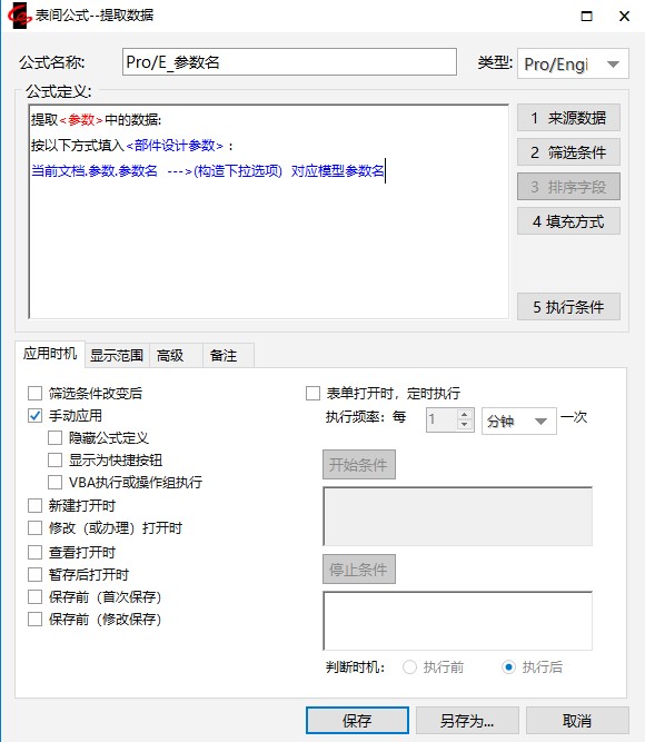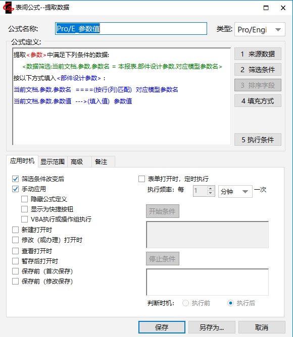 4.弹出“表间公式—提取数据”窗口,这个窗口和定义普通的提数公式的窗口几乎是一样的,只有一点小区别:在“公式名称”旁边多出来一个“类型”下拉列表,里面是Excel服务器2024 CAD版(CAD服务器2024)所支持的三种CAD软件的名称;我们这里要定义一个从Pro/E文档中提取数据的公式,所以类型选择“Pro/Engineer”;