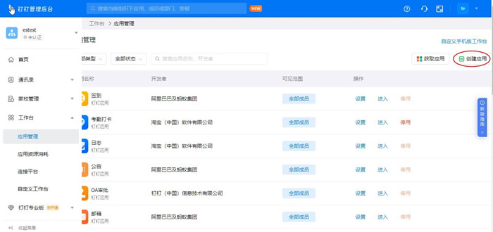 1.登录钉钉管理界面,选中【工作台】-【应用管理】点击【创建应用】。