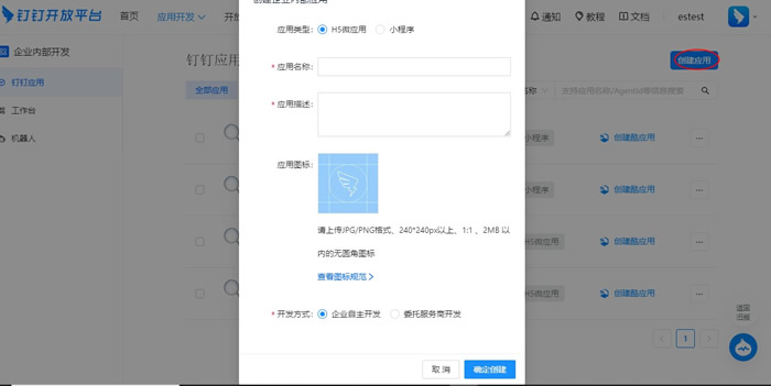 3. 点击“创建应用”,在窗口中输入“应用名称”、“应用描述”、上传应用图标: