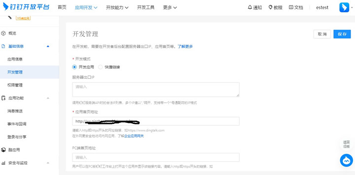 将ES服务器上的钉钉自建应用的开发信息与入下图钉钉应用中对应的“服务器出口IP”、“应用首页地址”、“PC首页地址”。