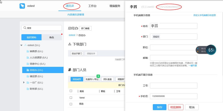 b. 点击对应的用户“李四”查看“员工UserID”信息输入到上图的“钉钉UserId”中。