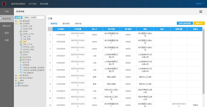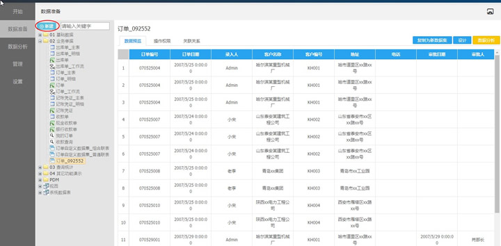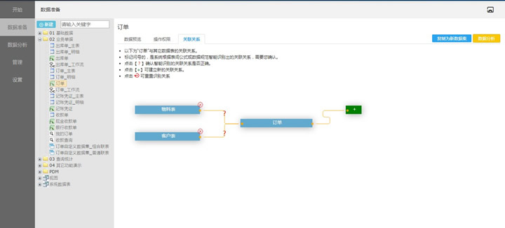 在通常的数据分析场景中,数据分析员在创建仪表板之前,需要系统管理员先准备好数据,包括对数据进行操作授权。系统管理员通过点击左侧导航的“数据准备”,可看到勤哲商业智能系统已将客户在EXCEL服务器中的模板数据结构自动导入到当前BI系统。