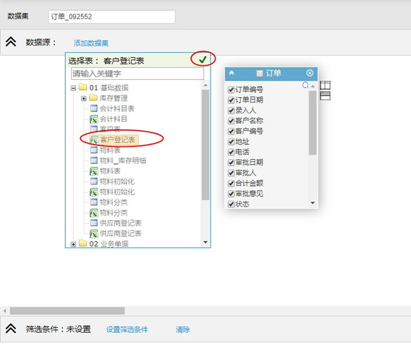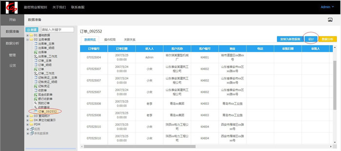 对于有数据集(如订单_092552)设计权限的用户,该用户点击图34-16中的【设计】按钮,可进入该数据集设计页面进行数据设计: