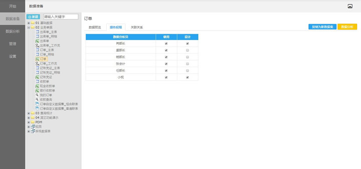 管理员选中数据集,点击【操作权限】属性页,可设置数据分析员用户的操作权限。