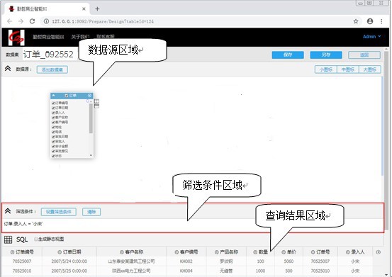 页面功能区域从上到下依次分为:数据源区域、筛选条件区域、查询结果区域3部分。
