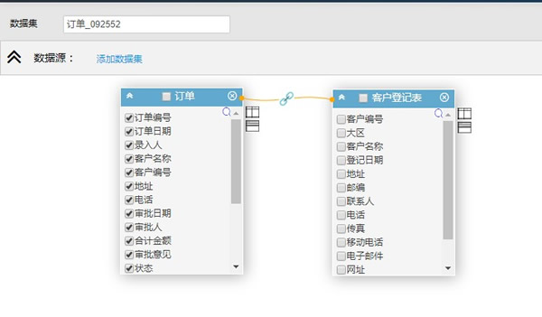数据分析员可以在数据源区域添加新的数据集并与之建立关联关系。