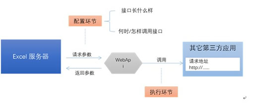 在上述过程中,有两个需要做的环节,一是配置环节:即,我们需要给出WebApi 的定义,并告知Excel服务器如何调用它;二是执行环节:即,根据WebApi的定义,实际执行调用过程,完成数据传递。